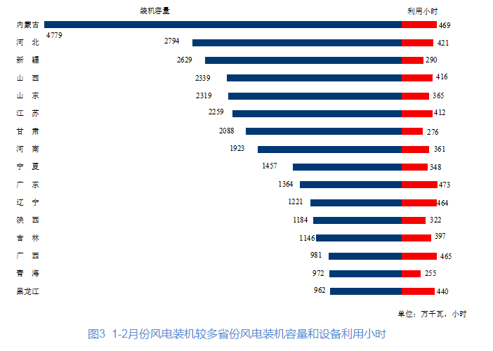 分类型看,1-2月份,全国水电设备平均利用小时为364小时,比上年同期减少45小时。在水电6000千瓦及以上电厂发电装机容量排前10的省份中,除广东、四川、云南外,其他省份水电设备平均利用小时均同比减少,其中,湖南、贵州、广西、湖北减少超过100小时,分别减少409、231、188和105小时;全国火电设备平均利用小时为720小时,比上年同期减少39小时,其中,燃煤发电设备平均利用小时为760小时,比上年同期减少36小时,燃气发电设备平均利用小时为360小时,比上年同期减少38小时。分省份看,全国有17个省份的火电设备平均利用小时超过全国平均水平,其中四川、新疆、重庆、青海和甘肃超过900小时,分别为979、977、924、922和918小时。与上年同期相比,21个省份火电设备平均利用小时同比减少,其中江西、上海、安徽减少超过100小时,分别减少167、129、109小时;全国核电设备平均利用小时1209小时,比上年同期增加14小时;全国并网风电设备平均利用小时401小时,比上年同期增加78小时;全国太阳能发电设备平均利用小时182小时,与上年同期基本持平。
